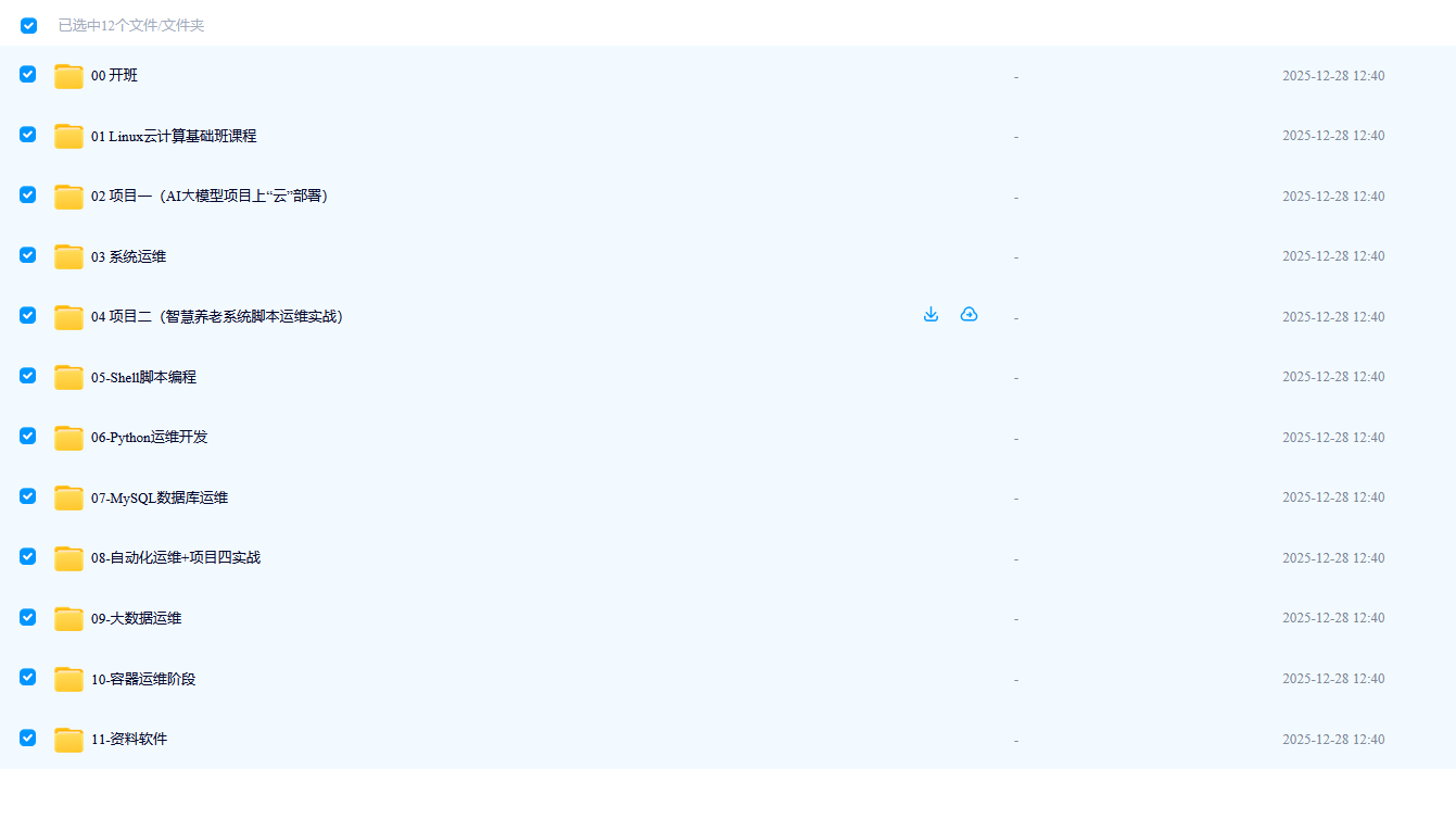 这次在内部学园那里付费购买了黑马的AI运维云计算内部教程,希望能够帮助要有需要的坛友不出意外的话应该是全网最全的教程 带课件 声明:本站所有文章,如无特殊说明或标注,均为本站原创发布。任何个人或组织,在未征得本站同意时,禁止复制、盗用、采集、发布本站内容到任何网站、书籍等各类媒体平台。如若本站内容侵犯了原著者的合法权益,可联系我们进行处理。