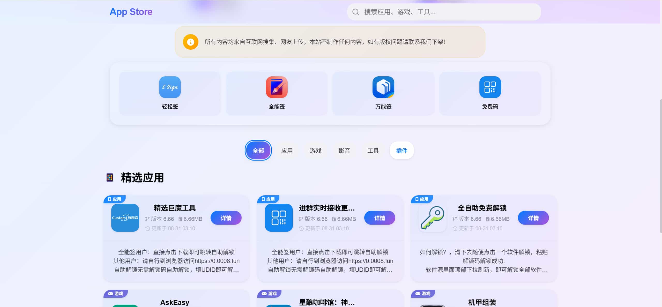 这套源码腾飞之前发过 [color=var(–focus-color)]IPA 软件源预览系统 ,不过作者又跟腾飞说把最新的第二版发了,腾飞简单的部署了,电脑端适配了,这套源码的 UI 还是不错的,带轮播和 ipa 软件左上角标签还有鼠标悬停 ipa 美化效果,话不多说喜欢的自行部署吧!