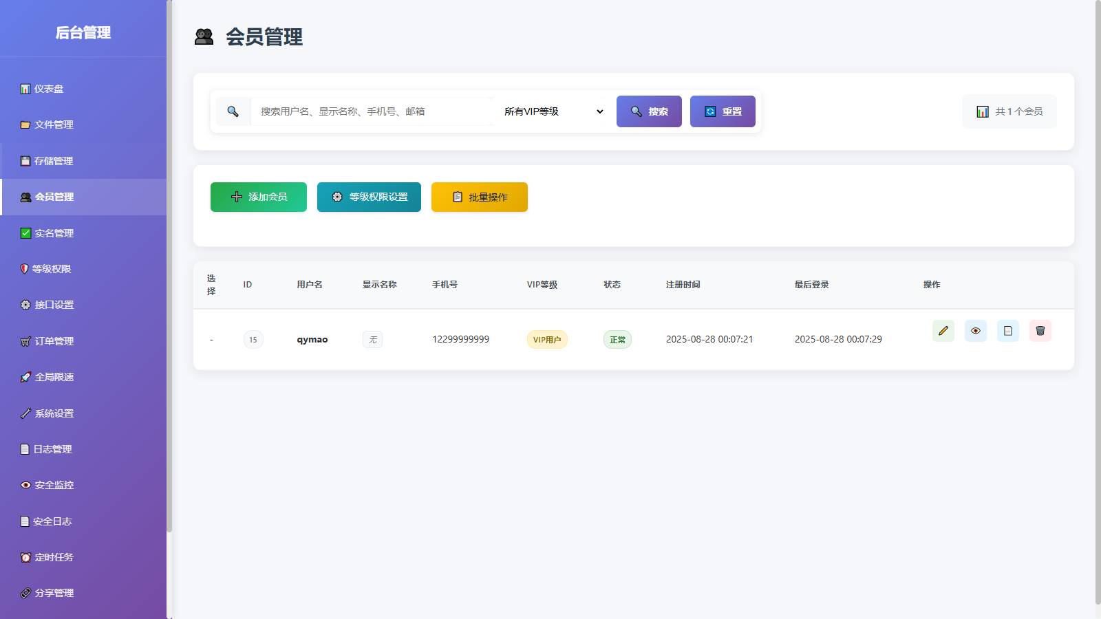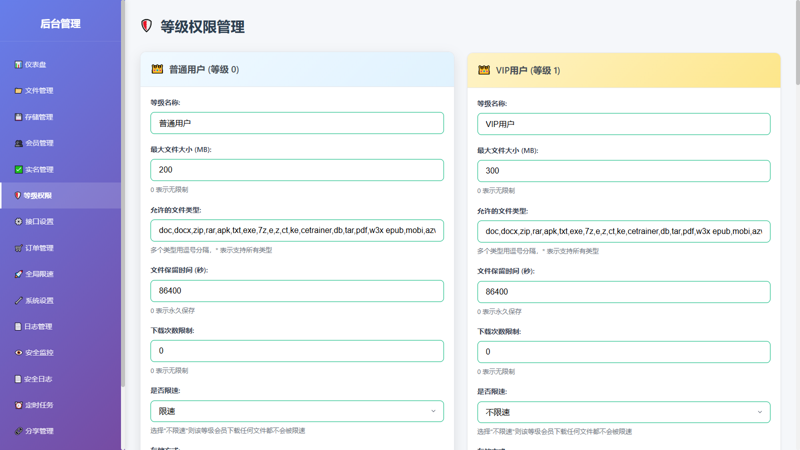 后台会员等级权限支持设置每个等级的用户上传的文件,是否默认永久存储