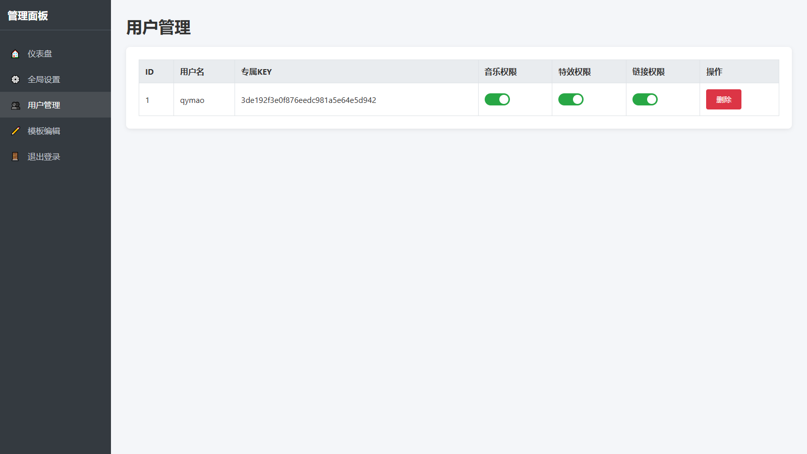 3、权限控制:后台可以精细化管理每个用户。看谁不爽?直接把他账号删了,觉得某个用户太跳?可以一键禁止他使用音乐、特效或者生成分享链接的功能。