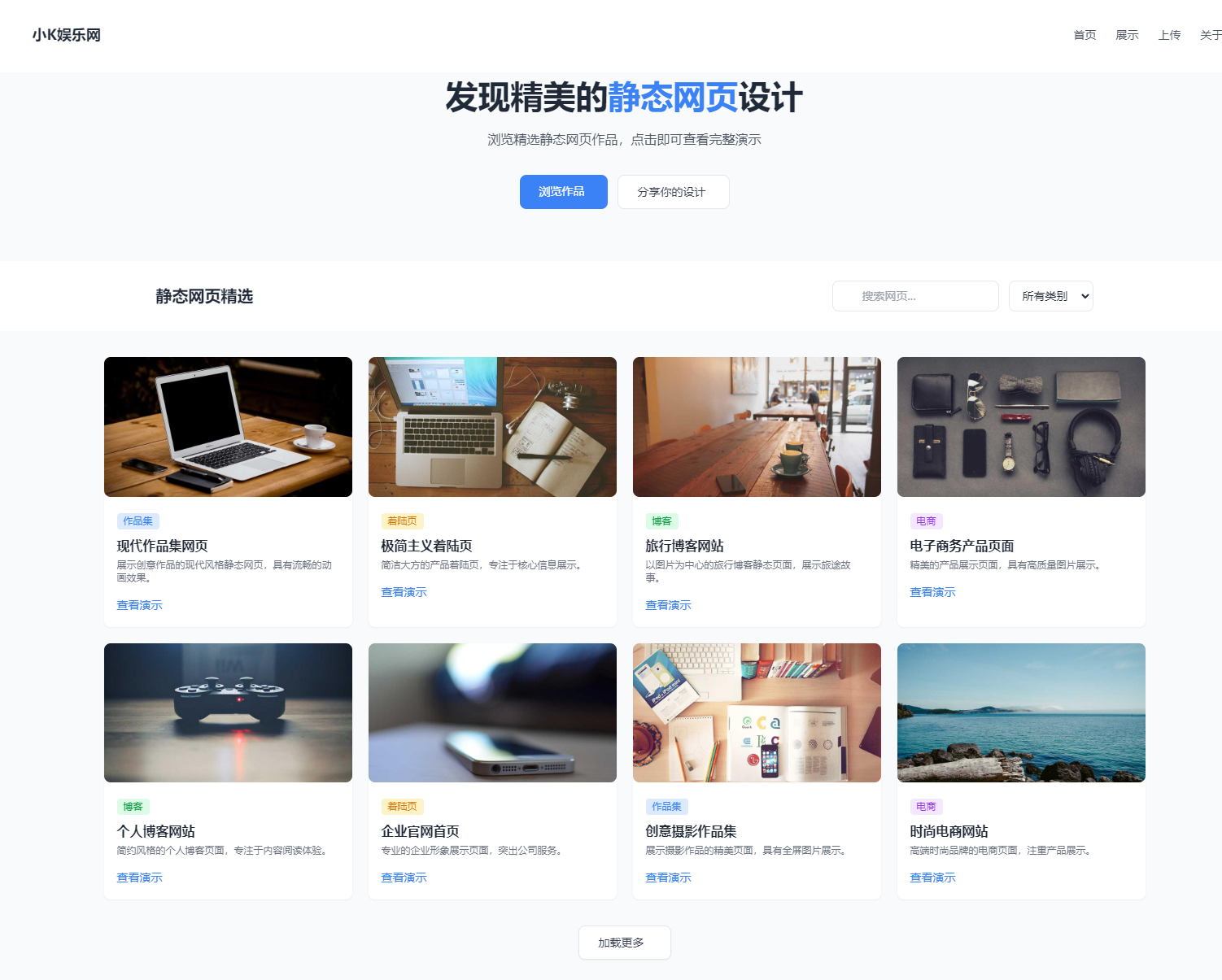 完整的页面结构:包含首页、展示区、上传区、关于和联系部分,形成一个完整的展示平台。